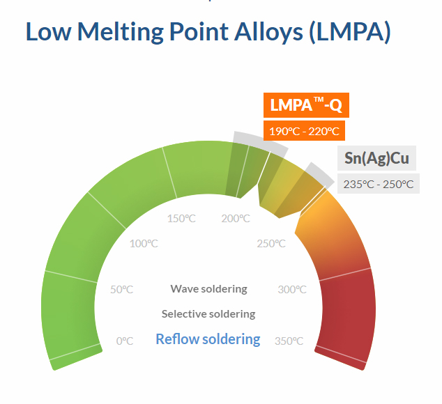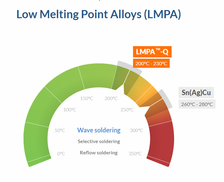The LMPA-™Q low melting point alloy allows for lower soldering temperatures and virtually eliminates the risk on damage by thermal stress, facilitating the use of temperature sensitive components and PCB board materials.